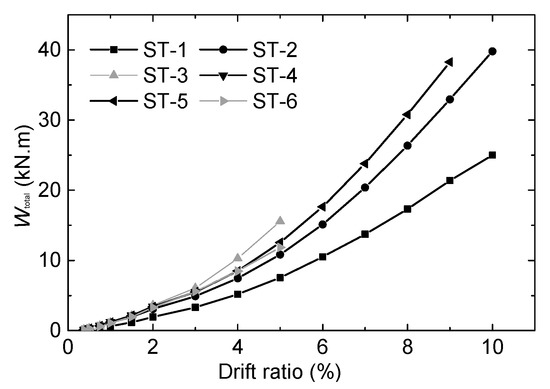 - The specimens that failed in mode I (ST-1, ST-2, and ST-5) have a better energy dissipation performance than the specimens that failed in mode II (ST-3, ST-4, and ST-6).