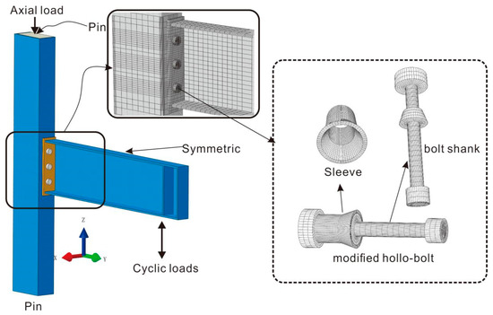 Frames with concrete-filled steel tube (CFST) columns have been widely used in modern construction, primarily because of the high structural efficiency of this type of column and the substantial savings with respect to cost and building time of such a construction [1]. For fully welded connections, the construction progress is slow and extensive erection and welding work is required, resulting in high labor costs; additionally, the on-site welding quality is difficult to guarantee. Moreover, according to the post-earthquake surveys conducted after the 1994 Northridge and 1995 Kobe earthquakes, severe damage and brittle fractures in welded steel moment-resisting structures were observed due to the poor performance of welding in beam-to-column connections [2]. Moreover, the fracture of steel structures under earthquake action is a low-cycle fatigue problem, and the fatigue strength of steel is greatly affected by fine cracks in the welding seam and its heat-affected zones. The bolted connections can meet the seismic performance requirements, but it is hard to access inside the steel tube when connecting beams to CFST columns, as openings in the steel tube are costly. To overcome the complexities associated with utilizing open section beams connected to hollow section columns, a new blind-bolting technique has been developed within the past few decades. This technique allows a fastener to be tightened from one side only, without the demand for access into the hollow section column.