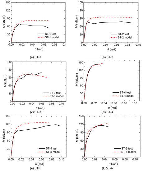 Comparison of test and finite element moment–rotation curves. (a) ST-1; (b) ST-2; (c) ST-3; (d) ST-4; (e) ST-5; (f) ST-6.