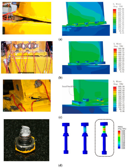 Observed and predicted failure modes. (a) The flexural deformation of the thin end-plate in specimen ST-1. (b) The outward deformation of the thick end-plate in specimen ST-4. (c) The local buckling at the root of the steel beam in specimen ST-6. (d) The fractured bolt shank in specimen ST-6 (bending and shearing fracture).