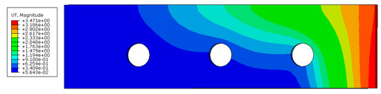 The initial stiffness of the joints anchored to the CFST columns by blind bolts can be predicted according to the classical component method recommended by EC3 [23]. The various finite element simulations show that when calculating the initial stiffness, the first two rows of bolts contribute to the tension of the connection, and the third row hardly contributes, especially for the proposed connections with a thin end-plate. The displacement cloud chart in Figure 21 shows that the area behind the third row of bolts undergoes approximately no displacement for specimen ST-3 at a drift ratio of 1%. Based on the plastic development of the FE models at the end-plate, the plastic hinge appeared around the center line of the third row of bolts. Therefore, when calculating the initial stiffness, the top two rows of bolts are assumed to be in tension, and the center line of the third row of bolts in compression is regarded as the center of the rotation of the specimen. The simplified initial stiffness mechanical model of the joint is shown in Figure 22a; keff, 1 and keff, 2 are the effective stiffnesses of the first bolt row and second bolt row, respectively, and they consist of four springs in series, representing the following stiffnesses: the end-plate in bending (k1), the bolt in tension (k2), the concrete in compression (k3), and the steel tube wall in bending (k4), as shown in Figure 22b. Therefore, k5 and k6 are the stiffnesses of the column wall in compression and concrete in compression, respectively. The CFST column is adequately rigid, therefore k5 and k6 are assumed to be infinite and neglected. These components are discussed further in the next section.