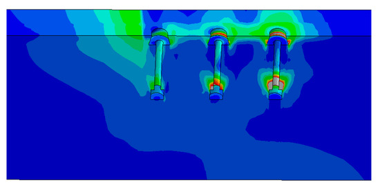 Most of the force in the concrete is transmitted to the tube face in the form of a cone with the anchor nut as the vertex, as shown in Figure 23. The calculation assumes that the concrete deforms elastically in the initial state and that the bolt force can be spread to the tube face in the form of a cone. The model of the bolt force in concrete is shown in Figure 24, and the cone diffusion angle is approximately 60°, according to the results of FE analysis.