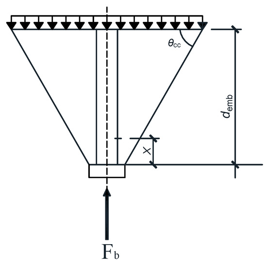 where demb is the embedded depth of the blind bolt, Ec is the elastic modulus of concrete, Ax is the compressive area of the concrete as a function of x, dnut is the diameter of the anchor nut, db is the effective diameter of the bolt, and θcc is the angle between the inclined plane and the horizontal plane of the cone. The parameters are shown in Figure 25.