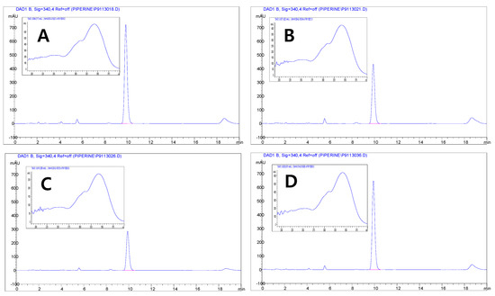 Piperine profiling was performed by using the HPLC method with some modification [25]. For quantitative analysis, a 0.1-g homogenized sample was dissolved in 50 mL methanol. The mixture was ultrasonically extracted at 50 °C for 20 min, cooled at room temperature, and filtered through a 0.45-μm syringe filter (Minisart).HPLC analyses were performed using an Agilent 1100 HPLC system (Agilent, Santa Clara, CA, USA) with a diode array detector (DAD, 340 nm). Eclipse C18 plus (4.6 × 150 mm, 5 μm, Agilent, Santa Clara, CA, USA) was utilized at 25 °C for piperine quantification. The mobile phase was acetonitrile/1% citric acid (45:55, isocratic). The sample injection volume was 10 µL, and the flow rate was set to 1 mL per minute with a run time of 20 min.