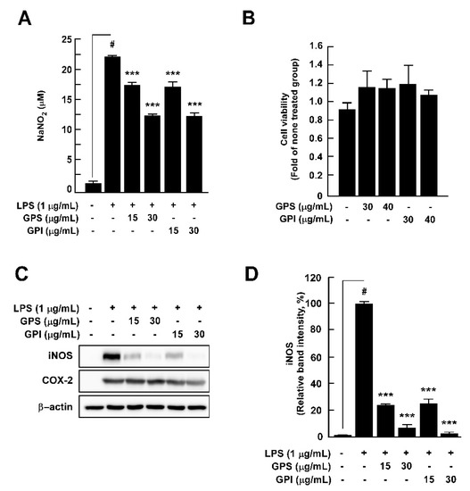 3.4. Effect of GPEs on LPS-Induced Nitrite Production, iNOS Expression, and Cell Viability of RAW 264.7 Cells