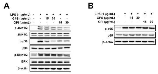 We investigated the effects of GPE on LPS-induced NF-κB and MAPK signaling pathways in RAW 264.7 cells, because these are the primary signaling pathways regulating LPS-induced iNOS expression. GPEs suppressed the LPS-induced phosphorylation of p38 and JNK1/2 and slightly suppressed the phosphorylation of extracellular-signal-regulated kinase (ERK)1/2 in RAW 264.7 cells (Figure 3A). Interestingly, although NF-κB is a canonical signaling pathway involved in LPS-induced NO production and inflammation in immune cells including macrophages and neutrophils, GPEs did not affect the phosphorylation of p65 in RAW 264.7 cells (Figure 3B).