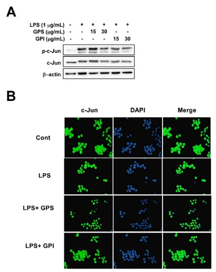 Because GPS and GPI only affected the LPS-induced phosphorylation of MAPKs, but not p65, we next evaluated whether GPS and GPI affected the LPS-induced phosphorylation of c-Jun and c-Jun translocation from the cytosol to the nucleus. Western blot analysis and immunofluorescence analysis results showed that although GPI suppressed LPS-induced c-Jun phosphorylation and c-Jun translocation from the cytosol to the nucleus, GPS only suppressed the LPS-induced phosphorylation of c-Jun, but not c-Jun translocation in RAW 264.7 cells (Figure 4).