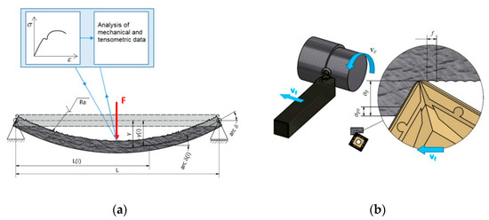 The physical nature of the derivation is analogous to the beam curvature parameters (Figure 1a) at the place of the highest load, and the angle of rotation of the cross-section on the supports are among the important ones. At a certain depth of cut ap0, i.e., on the neutral plane (Figure 1b), similar to the beam, the tensile and compressive stresses are equalized.