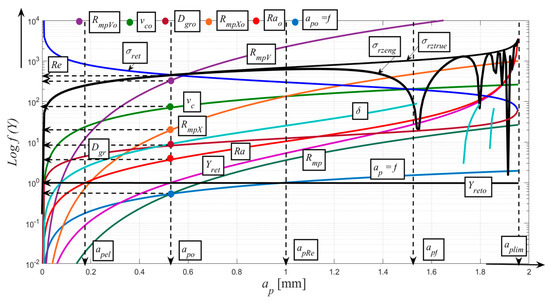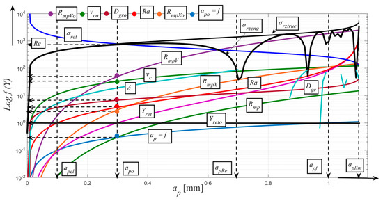 According to Equation (1), the calculation and subsequent graphical representation of the distribution represent 18 selected functions. The equations of all these functions can be generally applied to any material being machined with different combinations of machining parameters. Their set forms a comprehensive algorithm. The calculation, including graphical representation, can be done in MatLab or Excel. Depending on the current need, the selection of interest functions can be narrowed down or, on the contrary, extended by other functions related to the depth of cut ap. The functions in the implicit Equation (1) can be called continuous in relation to the depth of cut ap. We have defined and derived them in the following forms stated below.