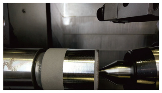 Within the framework of experimental verification, we used cylindrical samples with a diameter of 54.7 mm made of the base material C45, onto which a Stellite 6 was applied by High-Velocity Oxygen Fuel spraying; according to the conditions presented in Table 4, an average layer thickness was 0.55 mm. The length of the machined part of the sample was determined to be 88 mm. The machining was performed using a TUNGALOY RNGN 120400 LX11 43 tool, which was clamped in a MRGNR2525M12tool holder (Figure 5).