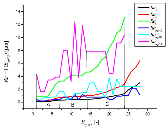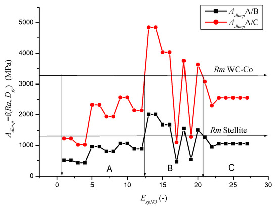 Adhesion Adhmp = f (Ra, Dgr) for the combination A/B and A/C, where: Section A (ExpNO 1–12) insufficient roughness for the desired adhesion, Section B (ExpNO 6–21) very good roughness for the desired adhesion, Section C (ExpNO 21–28) sufficient roughness for the desired adhesion.
