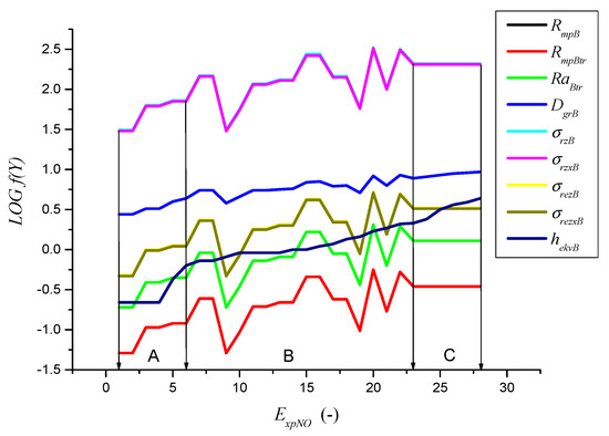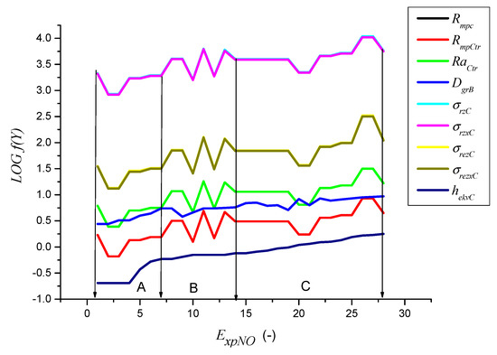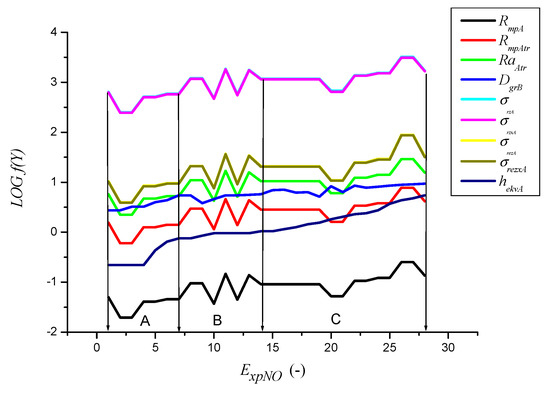 Comparison of working parameters LOG f (Wp) = f (ExpNO) for Carbide WC-Co, where: Section A (ExpNO 1–6) insufficient roughness for the desired adhesion, Section B (ExpNO 7–13) very good roughness for the desired adhesion, Section C (ExpNO 13–24) sufficient roughness for the desired adhesion.