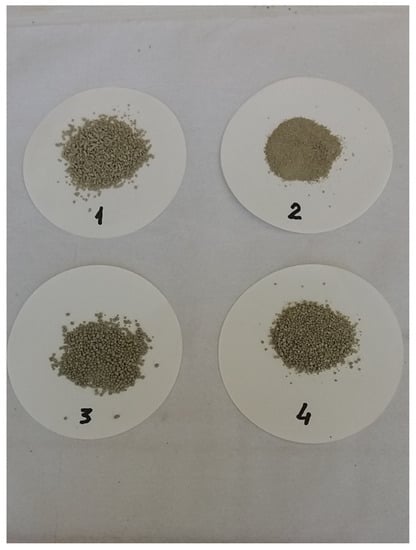 The shape of the granules before and after heating for 4 min in a MW oven and for 90 min in a conventional oven at 120 °C is shown in Figure 2. It is demonstrated that 4 min of heating of both spherical (which are more robust) and non-spherical granules in a MW oven caused a certain degree of destruction of the structure. In this context, it is noted that in the course of heating of granules by MW radiation, cases were encountered (e.g., Table 3) in which prolonged heating caused ignition of the granules.
