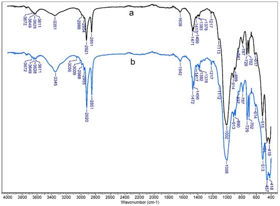 FT-IR spectra of BDMHDA–clay sample under: (a) MW free; (b) MW heated.