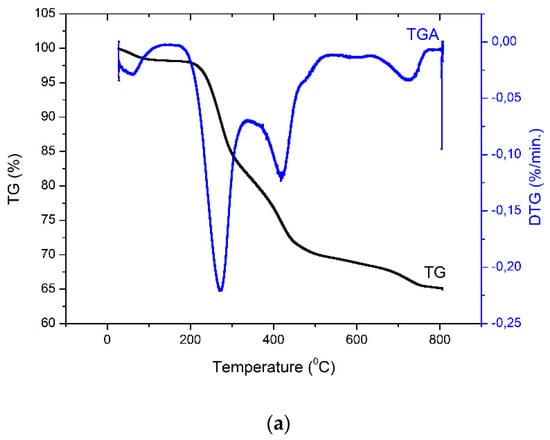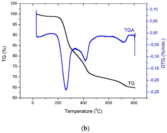 The second region in TGA curves (150–550 °C) is associated with the organic substances. In this region, the surfactant begins to decompose []. The initial decomposition temperature of ODTMA is 272 °C for a MW free sample. In MW heated samples, this temperature decreased to 264 °C. In the process of removing the impurities in the organo-clay used in water filtration and inactivation of bacteria, MW heating would be sufficient. In the second part of the dehydration stage (120–200 °C), elimination of adsorbed water still remains effective up to 200 °C []. The secondary thermal degradation step (420 °C) could be attributed to the desorption of surface hydration water, the loss of structural hydroxyl groups, and a crystal phase change [,]. Although this temperature step did not change in the case of the MW free sample (420 °C), the MW heated sample showed slight variations (417 °C). Thus, a small portion of the mass loss in this region is due to the removal of water and the majority of the mass loss is due to the decomposition of the surfactant. In this region, MW heating processes resulted in high mass loss compared to the ODTMA clay sample (MW free sample).