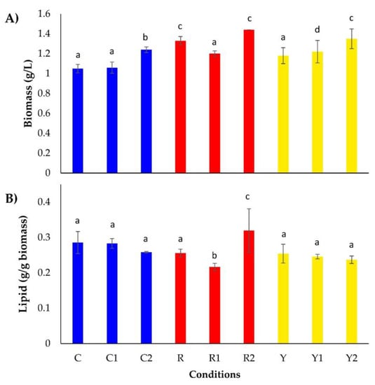 Analysis of P. tricornutum biomass (A) and lipid yield (B) in mixotrophic and autotrophic conditions under different colors of light. Abbreviations for the conditions are W: white, R: red, and Y: yellow, W1, R1 and Y1 refer to L1 media supplemented with 1% glucose, whereas W2, R2, and Y2 refer to the L1 media supplemented with 1% glycine. Each bar represents the average of three replicates, and error bars represent standard deviation. Means with different letters above the bars correspond to significant differences calculated using the multiple t-test. The columns identified with different letters (a–c) are significantly different using one-way analysis of variance (ANOVA) followed by a pairwise mean comparison Tukey’s test where differences were detected (n = 3, p < 0.05).