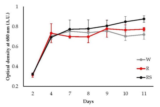 P. tricornutum grown in red light until the end of exponential phase (from day 1 to 7) and then shifted to white light (RS) showed the greatest growth compared to all other conditions tested (Figure 2, Appendix A—Figure A1). In addition, RS is significantly better to promote growth compared to continuous white (W) or red light (R) (Figure 2).