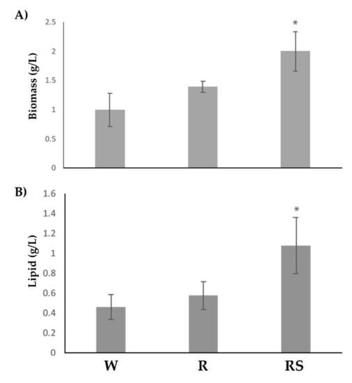 Analysis of P. tricornutum biomass (A) and lipid accumulation (B) in autotrophic conditions under continuous white (W) light, red (R) light, and red with light shift (RS), which is red light during the exponential phase and then a shift to white light. Experiments were done in triplicate in 50 mL liquid culture, and cells were collected at day 10. Results are expressed as mean value ± standard deviation. An asterisk (*) indicates significant differences compared to the white light (W) used as control. Statistical analysis was done using one-way ANOVA.