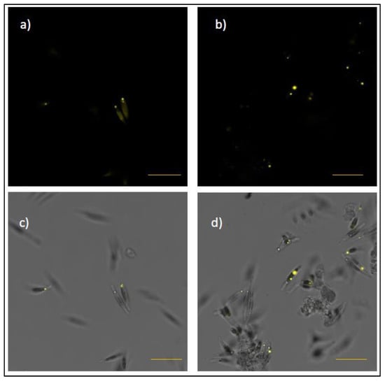 Intracellular lipid bodies (LBs) were visualized using a modified Nile Red (9-diethylamino-5H-benzo[a]-phenoxazine-5-one) staining method [,]. Briefly, 1 mL of the algal culture was centrifuged at 10,625× g for 10 min. Then, the cell pellet was resuspended in 500 µL of 20% dimethyl sulfoxide (DMSO) and vortexed for 1 min at room temperature. Cells were centrifuged at 10,625× g for 5 min, and the cell pellet was resuspended in 500 µL of water and vortexed before adding Nile red solution (0.5 mg mL−1 dissolved in acetone) and incubated for 5 min in dark at room temperature. Stained LBs imaging was performed under a confocal laser scanning microscope (Leica SP8) using 40× magnification. The Nile red fluorescence was detected using a UV light source at excitation/emission wavelengths of 488 and (490–550) nm.