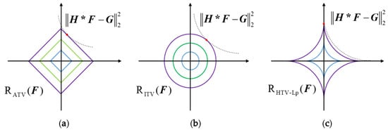 Because the pixel information is not fully considered in the traditional ATV model, only the information of the first-order gradient is considered. To enhance the deblurring effect, the traditional ATV model is extended to the high-order TV model, which considers the first-order gradient information, and adds the high-order gradient information to the prior term. Figure 1 depicts the contour maps that highlight the advantage of Lp-pseudonorms. The contours of the L1-norm, L2-norm and Lp-pseudonorm are depicted in Figure 1a–c. The L1-norm and L2-norm can be expressed as and , respectively; whereas, the Lp-pseudonorm is defined in the following paper. In Figure 1, the dotted lines represent the fidelity term, while the solid blue lines represent the contours of the prior item. The red dots represent the intersection of the dotted line and the solid line, while the intersections with the axes represent the better sparseness of the image gradients. It is also observed that the Lp-pseudonorm provides a greater degree of freedom compared with L1-norm and L2-norm, which can better depict the sparsity of the image gradients. Therefore, the Lp-pseudonorm was added to the prior terms to improve the robustness of the image gradients.