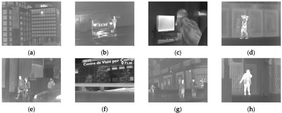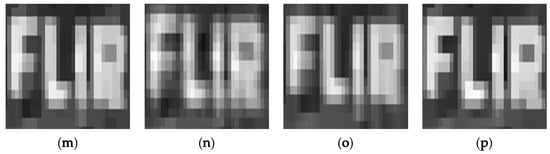 To demonstrate the superiority of the proposed HTV-Lp model, Figure 2 shows eight different test images downloaded from the publicly available datasets found in http://adas.cvc.uab.es/elektra/datasets/far-infra-red/, and http://www.dgp.toronto.edu/~nmorris/data/IRData/. Infrared images of http://adas.cvc.uab.es/elektra/datasets/far-infra-red/were obtained using an infrared camera (PathFindIR Flir camera) with 19-mm focal length lens. The size of the “Store.BMP” is 506 × 408 and that of the rest images are 384 × 288. The Gaussian blur and motion blur kernels are generated by MATLAB functions. For example, MATLAB function “fspecial” (‘gaussian’, B × B × σ) generates a B × B Gaussian blur kernel with a standard deviation of σ. For convenience, the kernel is referred to as (G, B, B, σ). “fspecial” (‘motion’, L, θ) generates a motion blur kernel with a motion displacement of L and motion angle of θ, which is referred to as (M, L, θ) for convenience. Furthermore, Gaussian noise standard deviations of 1, 3, and 5 are used.
