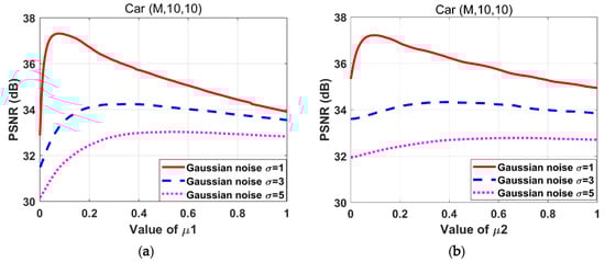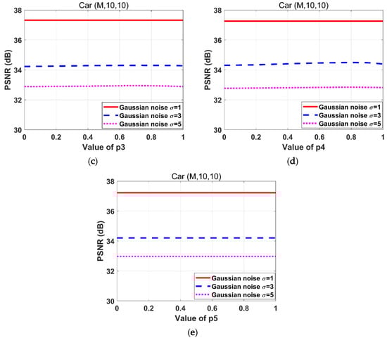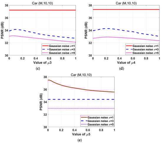 Effects of variations on the peak signal-to-noise ratio (PSNR) for the “Car” images degraded by the motion blur kernel (M, 10, 10) with Gaussian noise standard deviations 1, 3, and 5 respectively. (a) ; (b) ; (c) ;(d) ; (e) .
