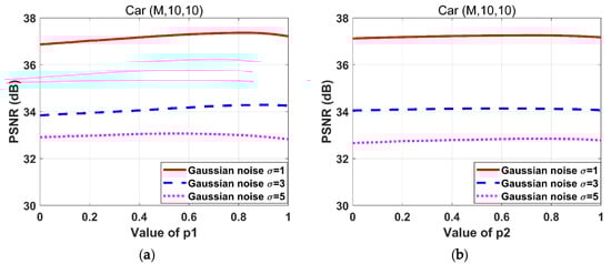 The parameters should be properly selected. We try each parameter tentatively until the iterated image is properly recovered. The ranges of each parameter are determined empirically as . The parameters are adjusted by traversing these ranges with a step size of 0.01. When PSNR achieves a maximum value, the corresponding parameter values are selected as the optimal ones. Figure 3 depicts the effect of on PSNR during the adjustment. Notably, when the PSNR reaches its maximum, the optimal selections of vary, hence, it is effective to adjust these parameters separately.