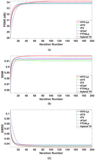 Dynamic iterative curves with different evaluation metrics. (a); (b); (c) are figures illustrating effects for the degraded “Car” image with the motion blur kernel (M, 10, 10) and Gaussian noise standard deviation of 3 on PSNR, structural similarity (SSIM), gradient magnitude similarity deviation (GMSD), respectively.
