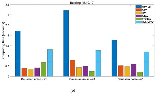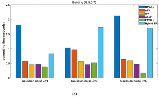 Comparison of computing times of different deblurring methods. (a) degraded “Building” image with Gaussian blur (G, 5, 5, 7) and (b) degraded “Building” image with motion blur (M, 10, 10).