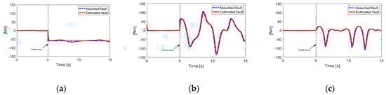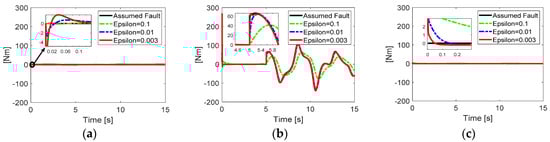 For the extended state observer of Equation (10), the four parameters such as and should be suitably selected. The turning parameters in the set of that should satisfy the Hurwitz condition are quite related to the qualities of the observer such as the accuracy and peaking values. From this consideration, the turning parameters were set as . For , Equation (17) shows that the value of highly affects the behavior of the observer convergence. Therefore, three different values of , and were considered in this simulation. In Figure 2b, it can be seen that the peaking value highly defends the selection of . The smaller value of causes faster convergence, but the high magnitude peaking value in the fault estimation. As a trade-off between the convergence and the peaking value, was selected.