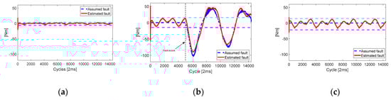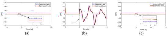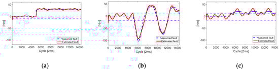 Fault estimation results in the simulation with multiple joint faults. (a) Joint 1; (b) Joint 2; (c) Joint 3.