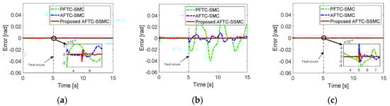 Tracking error at each joint in the simulation with a single fault at Joint 2. (a) Joint 1; (b) Joint 2; (c) Joint 3.