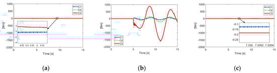 The parameters of the proposed AFTC-SSMC (Equation (25)) were suitably chosen as , and the function in the control law in Equation (46) and the AFTC-SSMC was replaced by the saturation function