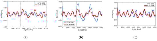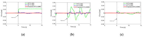 In Figure 3b, the single fault occurs at Joint 2 after five seconds. Figure 3 shows the fault estimation algorithm given in Equation (10) seems to be working well even though its estimation error still exists on the order of 1/100 of the fault magnitude. In Figure 4, without fault estimation, PFTC-SMC cannot guarantee the performance after the fault occurs. Unlike PFTC, the joint position errors of AFTC-SMC and proposed AFTC-SSMC look very different, but they were all on the order of 10−3, so that the overall trajectory tracking performance of the two control algorithms can be said to be acceptable in this simulation. However, it can be seen that the proposed AFTC-SSMC has very high accuracy after a fault occurs. This fault-tolerant capability can be said to come from the synchronous SMC. Each joint error is coupled and constrained due to the synchronization errors and the newly defined synchronous sliding surface.