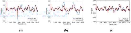 The overall results of this experiment are similar to the previous results from the simulations and the single fault experiments. The fault estimation capability is still at the same level as that of the single fault case, as seen in Figure 13. The trajectory tracking performances of the two algorithms can be said to have behaviors similar to those seen in Figure 14. AFTC-SSMC showed the smaller trajectory tracking errors, especially after the faults occurred at 10 s, demonstrating the fault-tolerant characteristics, even in this multiple faults case. In Figure 14a,b, it can be seen that the picking phenomenon due to the slow response of the AFTC strategy was reduced by using the synchronization technique. And the synchronization joint errors were shown in Figure 15.