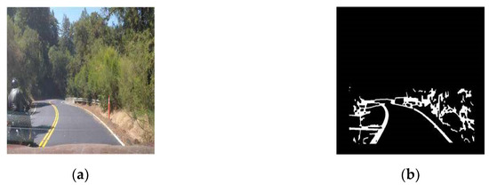 In order to improve detection accuracy, the majority of the noise in the raw image should be processed in the background layer using image segmentation technology. The lane line can act as the objective layer. On the other hand, the method of the largest variance between classes is used to remove the interference information and achieve better segmentation of the road image. The variance between classes of the pixels [18], segmented by the image I(x, y), is computed by Equation (2).