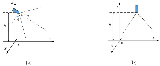 Because affine transformation is based on the corresponding relationship of image coordinate transformation, the transformation from inverse perspective to aerial view can be performed [21]. The principle is as follows: the raw image is set as , and the transferred image is ; the image coordinate, which is transferred by the transformation matrix, is . The alpha and beta angles represent the pitch and deviation angles of the on-board camera, respectively. The raw image coordinate system is the reference coordinate system, so w is set as 1. The expressions for x and y are as follows: