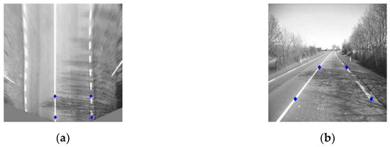 According to the equations, as long as the coordinates of four noncolinear points in the image are found, the transformation matrix T can be obtained. Then, each point coordinate in the aerial view, corresponding in the original image, can be solved using Equation (6). Figure 4 shows the aerial view obtained from the affine transformation; those that are marked in Figure 4 are the selected coordinate points.