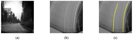 Unilateral lane line estimation: (a) Raw image; (b) Image of the aerial view; (c) Lane line marking.