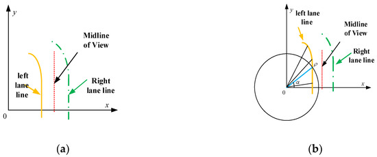 According to Figure 11, the angle of the lane line in the polar coordinate system varies from 0 to . If the remaining conditions are met, the transformation from the rectangular coordinate system to polar coordinate system can be fulfilled. During lane line fitting, the lane should be divided into straight line fitting and curve line fitting. Additionally, before the ROI is obtained, the differential coefficient should be solved. Based on Equation (26), the feature point (x, y) in the rectangular coordinate system can be transferred to point in the polar coordinate system. Finally, the lane line feature points are fitted by the least square method in the polar coordinate system.