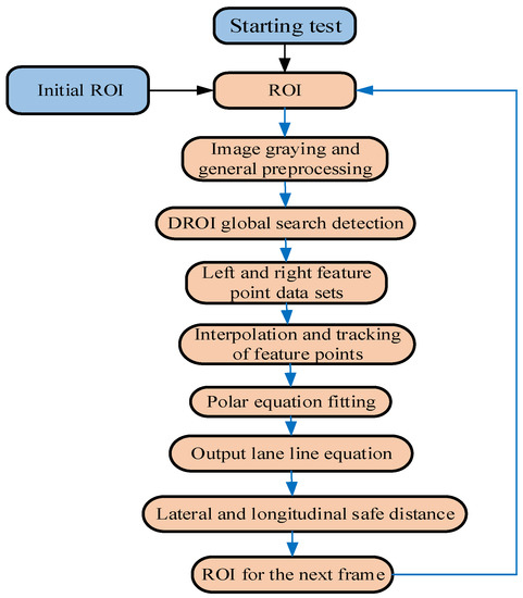 In recent years, advanced driver assistance systems (ADAS) and autonomous driving are becoming more and more important to reducing traffic accidents. As a key technology for intelligent vehicles, lane detection has attracted widespread attention from plenty of institutes and automobile technology companies [1]. Among the research, vision-based lane detection has always been a hot topic in the field of lane line detection. For example, in these studies, the selection of the region of interest (ROI) has been widely used to limit the range of lane detection because it can efficiently reduce the level of redundant data to improve the real-time capabilities and accuracy. In [2], one quarter of entire image, i.e., near the bottom of the image, was selected as the ROI; however, the hood and front windshield of the car can cause false edges, which would affect subsequent lane line detection. In order to improve the accuracy capabilities, the vanishing point of the lane line, indicating the point at which two lane lines cross in the distance, was treated as the upper boundary of the ROI [3,4,5]. Then, Hai [6] proposed setting two thirds of the region below the vanishing point as the ROI. Although the calculation amount of this method is less than that of the method with the vanishing point as the upper boundary, this method still cannot effectively extract the ROI following a safe distance from the front field of view. Similarly, to improve detection performance, the ROI was separated into two parts and the piecewise linear stretch function was used to enhance the pixels of images in the region; however, the boundary was difficult to select [7]. Furthermore, in [8], to improve the accuracy of lane detection, the static ROI was divided into four subareas, i.e., the left and right lane lines in the near and far fields of view, but it was subject to interference by false edges such as disturbances in the road or obstacles on either side. Gaikwad [9] proposed the use of the first frame of the lane detection images to initialize the ROI; detection would then be performed according to the ROI; however, the accuracy of the approach needs to be improved.