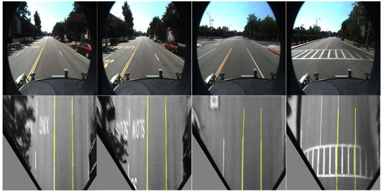 As shown in Table 2, the detection performance of the proposed method is better than those of the other methods. The main reasons are as follows: in [30], the lane line vanishing point is not easy to choose and there is an absence of lane line, so this method is unsuitable for worn lane lines. The RANSAC algorithm [29] is unsuitable for lane lines with large curvatures. The method proposed by Seo encounters difficulties improving lane line detection according to the driving direction due to the inverse of the lane line. The detection results of the method presented in this paper are shown in Figure 15.