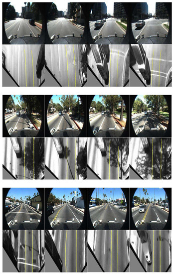 If self-gathered data is used for the verification of lane line detection algorithms, it is hard to evaluate in a common standard. The Caltech datasets are widely utilized because they have not only structured paths, but also unstructured roads including shadows and road marks of varying intensities. Therefore, these data are used to evaluate the algorithm in this paper. Some classic roads are shown in Figure 14.