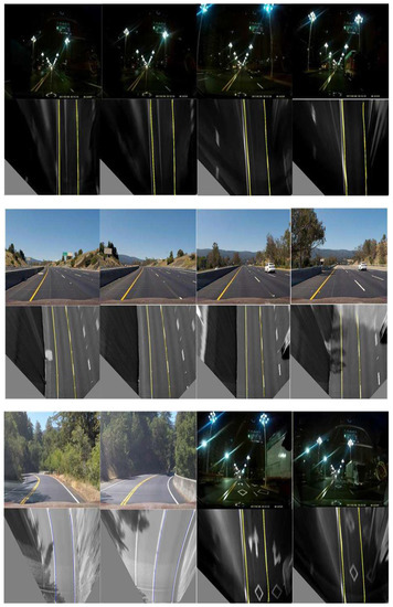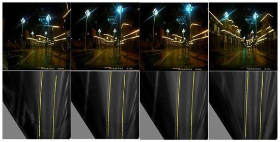 Table 3 shows the test results of the proposed detection method under different driving scenarios. It is seen that for all tested driving scenarios, the positive detection rate of the proposed method is close to 99%, and the missing detection rate is less than 3%, which meets the requirements of lane line detection. In addition, Figure 17 shows the test results under different road conditions.
