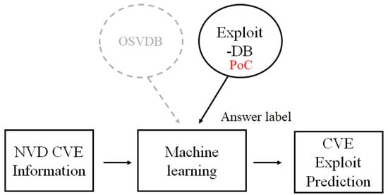 However, a number of researchers have undertaken studies of the risk of CVE assuming that CVE in E-DB has been exploited, which is considered as a reasonable assumption in academia [,,]. Recent risk prediction models that can obtain vulnerability information from NVD and answer labels from E-DB are shown in Figure 1. They then applied various machine algorithms to look for appropriate algorithms and parameters to obtain the best prediction result.