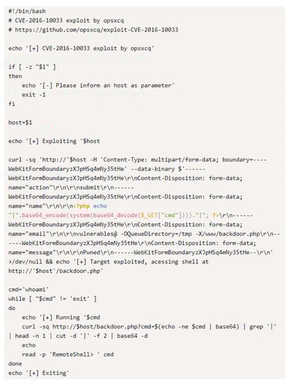 The core function of Exploit-DB is to provide PoC codes that can exploit CVE. PoC is a simple code snippet that can explain how to exploit a vulnerability. For instance, a PoC code shown in Figure 2 is to exploit CVE-2016-10033, a vulnerability that PHPMailer can run an arbitrary code [,]. Hackers can easily perform similar attacks if a PoC is available in the Exploit-DB.