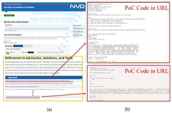 In order to understand the problem, it is necessary to know what kinds of information that NVD data provide. Figure 3a shows the information of CVE-2016-10033 on the NVD homepage []. For example, Current Description gives general information about the CVE and why and how the CVE is dangerous. In particular, the Reference section in a yellow box in Figure 3a provides several URLs, so-called references, related to CVE. These references provide additional information not directly available from the NVD Database, such as CVE’s vendor information, other databases, analysis reports, related e-mails, and patch information.