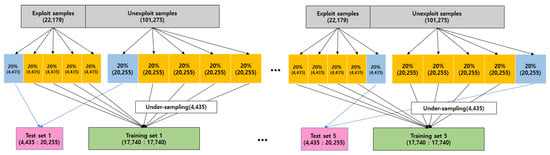The total number of samples (CVE) of the data set was 123,454. A total of 22,179 CVEs were exploited samples and the remaining 101,275 CVEs were unexploited ones. Around 18% of CVEs were exploited. Unfortunately, datasets with such extreme class ratios are not preferable for training data because machine learning models are likely to be biased. A solution to this problem is the use of the under-sampling technique. This technique can randomly select a smaller number of samples from the bigger group to make the class ratio of the training dataset to be 1:1. As shown in Figure 4, we made 1:1 ratio training sets by under-sampling unexploited samples while maintaining a 2:8 ratio to form test sets to see how our model would work in real situations. In addition, to reduce the possible adverse effect by sampling bias, we divided the entire data set into a total of k training and test sets and tested them independently and used the average of these results. This method is called k-fold cross validation. We set k to 5 in our experiment.