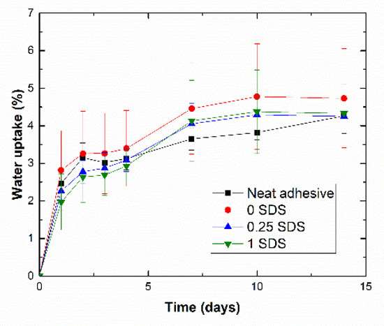 The combination of these effects, as shown in the schematics of Figure 2, thus, explains the slight differences observed for each condition. In the case of the CNT reinforced adhesive without surfactant, a poor CNT dispersion is achieved, as stated in previous studies [31], so that the hydrophobic effect of CNTs is not so prevalent. Alternatively, the samples with 0.25 wt% and 1 wt% SDS show a similar trend, with a slightly lower water uptake than the sample without surfactant. In this case, the effect of the better CNT dispersion achieved was slightly prevalent over the amphiphilic effect of SDS surfactant. In the case of the neat adhesive, the water uptake was given directly by the physical behavior of the epoxy matrix.