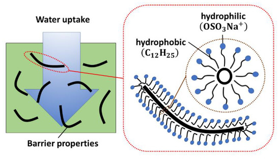 Schematics of combined effect of the water uptake (left) and amphiphilic behavior of sodium dodecyl sulfate (SDS) (right).